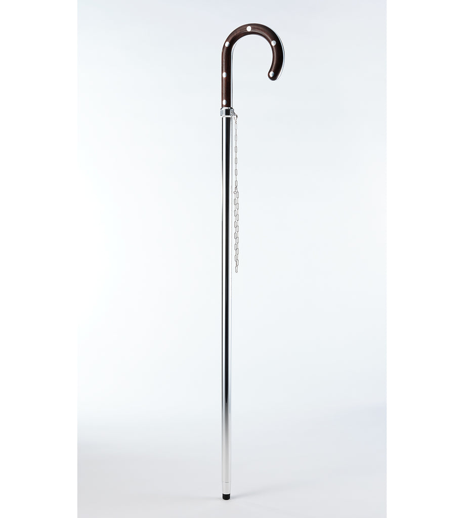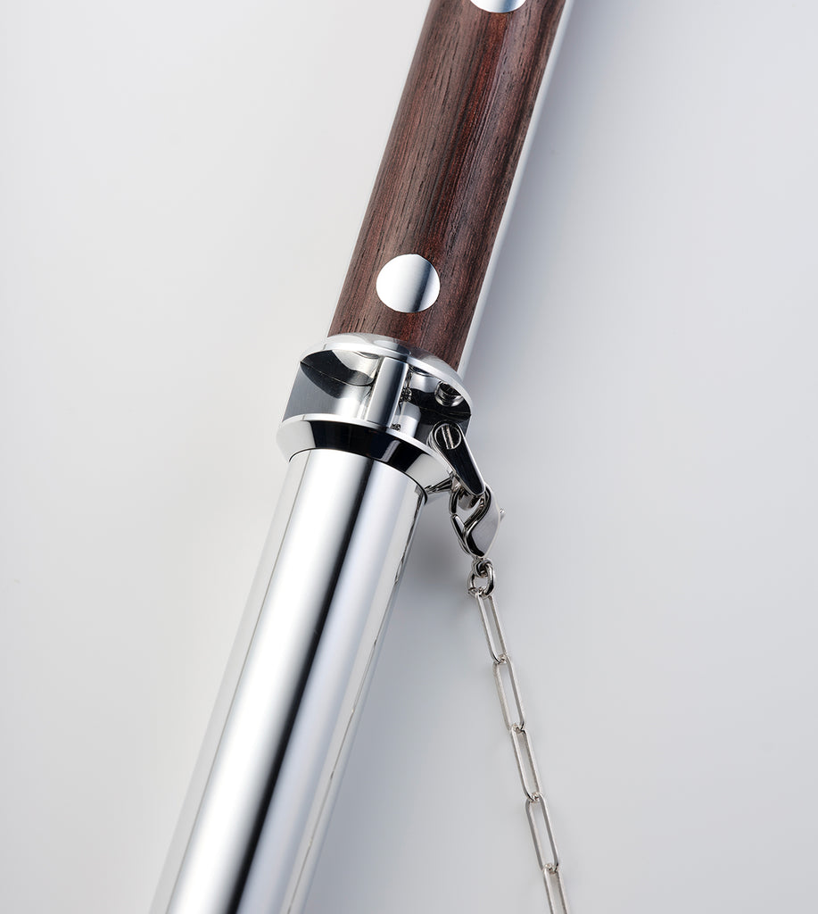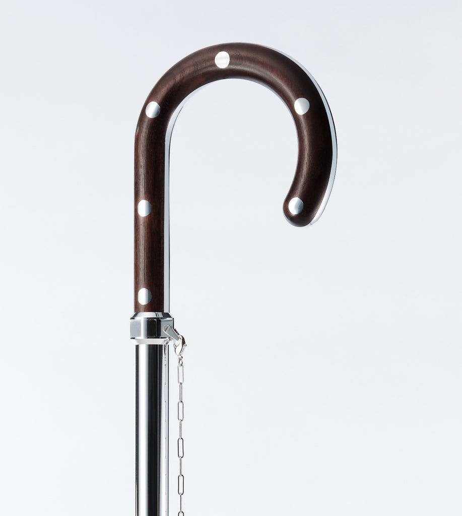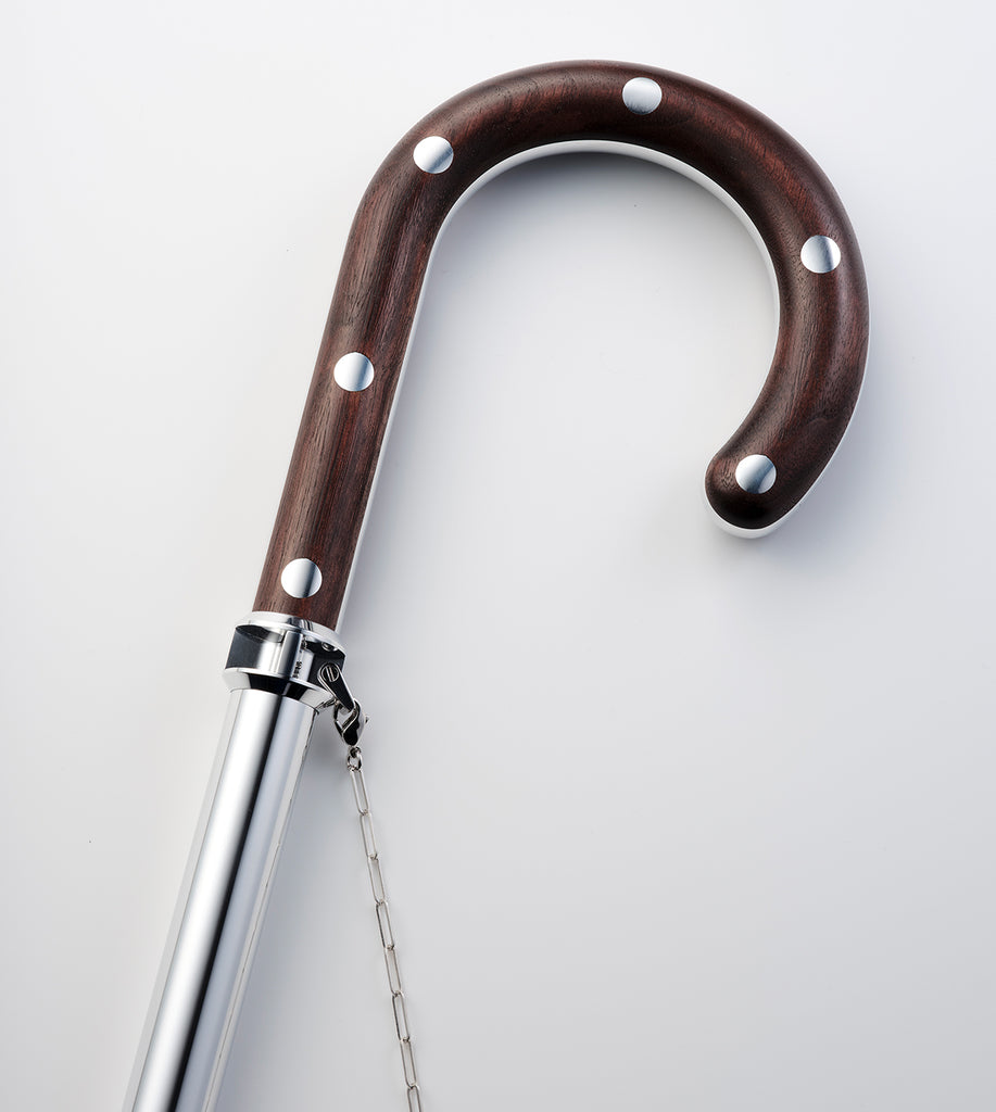 MATSU high-grade men's walking stick with J-grip. The J-grip can be hung on the elbow like an umbrella handle. The grip is made of extra super duralumin and walnut, and fastened with extra super duralumin bolts. It is lightweight, durable, and impact resistant. The smooth finishing of materials of varying hardness requires the skill of a master craftsman. The aluminum alloy shaft has both lightweight and strength.